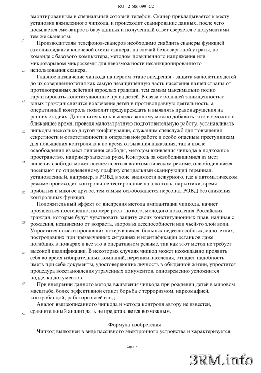 Главное назначение чипкода на первом этапе внедрения - защита малолетних детей до их совершеннолетия как самую незащищенную часть населения нашей страны от противоправных действий взрослых граждан, тем самым максимально полно гарантировать конституционные права детей. В связи с большей защищенностью юных граждан снизится вовлечение детей в противоправную деятельность, а оперативный контроль позволит предупреждать и выявлять правонарушения на ранних стадиях. Дополнительно к вышесказанному можно добавить, что возможно в ближайшее время, проведя малозатратную подготовительную работу, устанавливать чипкоды несколько другой конфигурации, служащим спецслужб для повышения секретности и ответственности в оперативной работе и особо опасным преступникам для повышения контроля как во время отбывания наказания, так и после освобождения из мест лишения свободы, методом вживления чипкода в подкожное пространство, например запястья руки. Контроль за освободившимися из мест лишения свободы может осуществляться в автоматическом режиме, освободившиеся посещают по определенному графику специальный сканирующий терминал, установленный, например, в РОВД в зоне видимости дежурного, где в автоматическом режиме происходит контрольное тестирование на алкоголь, наркотики, время прибытия и многое другое, тем самым освобождается персонал РОВД без снижения контрольных функций.