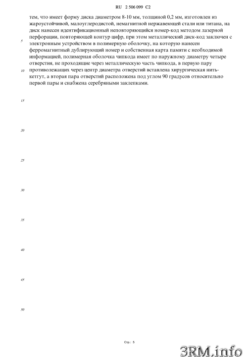 Изобретение относится к медицине. Чипкод выполнен в виде пассивного электронного устройства и характеризуется тем, что имеет форму диска диаметром 8-10 мм, толщиной 0,2 мм, изготовлен из жароустойчивой, малоуглеродистой, немагнитной нержавеющей стали или титана, на диск нанесен идентификационный неповторяющийся номер-код методом лазерной перфорации, повторяющей контур цифр, при этом металлический диск-код заключен с электронным устройством в полимерную оболочку, на которую нанесен ферромагнитный дублирующий номер и собственная карта памяти с необходимой информацией, полимерная оболочка чипкода имеет по наружному диаметру четыре отверстия, не проходящие через металлическую часть чипкода, в первую пару противолежащих через центр диаметра отверстий вставлена хирургическая нить-кетгут, а вторая пара отверстий расположена под углом 90 градусов относительно первой пары и снабжена серебряными заклепками. Чипкод позволяет идентифицировать человека независимо от его состояния, возраста и дееспособности.