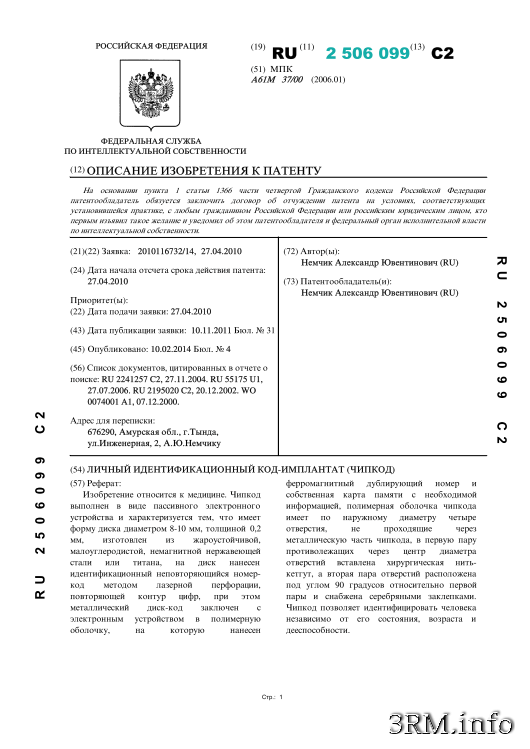 Личный идентификационный код-имплантант (далее чипкод) предназначен для идентификации человека независимо от его возраста, состояния и дееспособности.