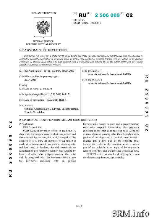 ЛИЧНЫЙ ИДЕНТИФИКАЦИОННЫЙ КОД-ИМПЛАНТАТ (ЧИПКОД)