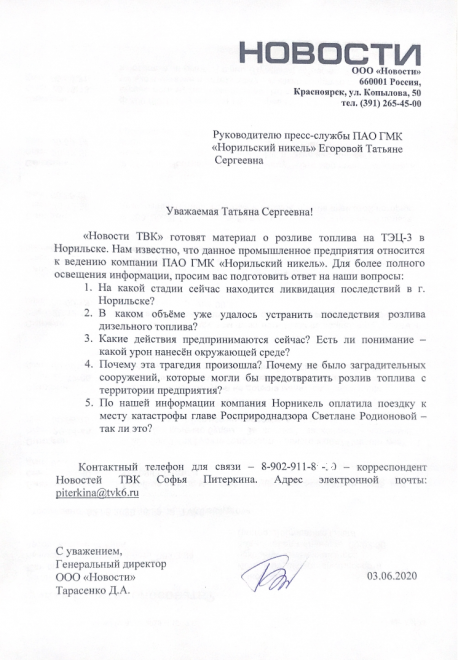 Накануне источники «ТВК Красноярск» также сообщали, что глава надзорного органа летит на расследование обстоятельств аварии на оплаченном «Норникелем» самолете. Мы направили соответствующий запрос в пресс-службу компании.