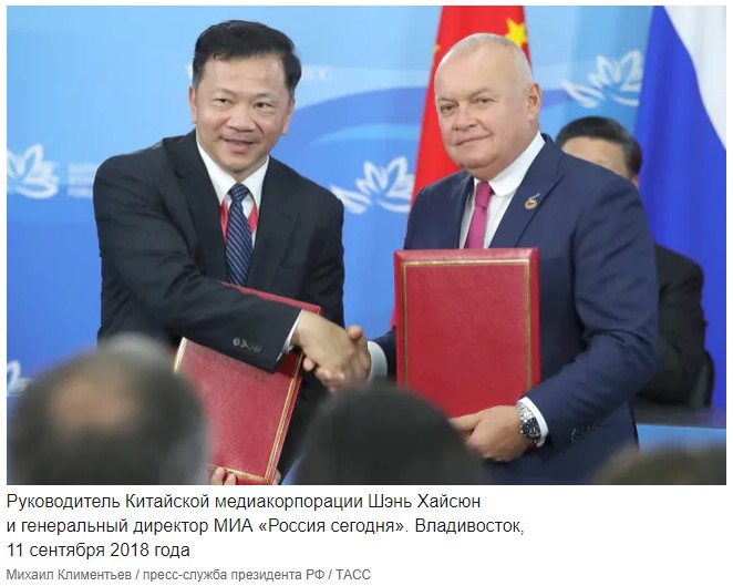 Главный китайский пропагандон Шэнь Хайсюн и Дмитрий Киселев, руководитель МИА "РОссия сегодня" заключают пакт о сотрудничестве. 2018 год