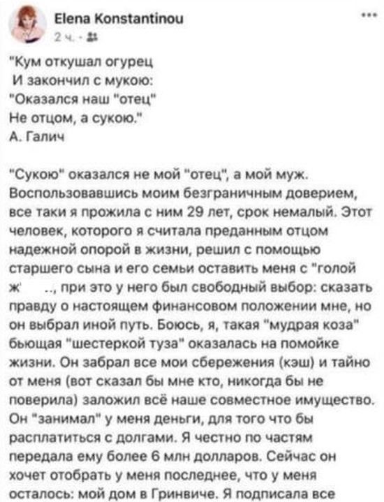 "Сукою" оказался мой муж" - так начинает пост, дальше встречаются и слова порезче - от "подонка" до "твари". Елена пишет, что прожила с супругом 29 лет, а он забрал у нее все наличные сбережения ("я по частям передала ему более 6 млн долларов") и заложил совместное имущество.